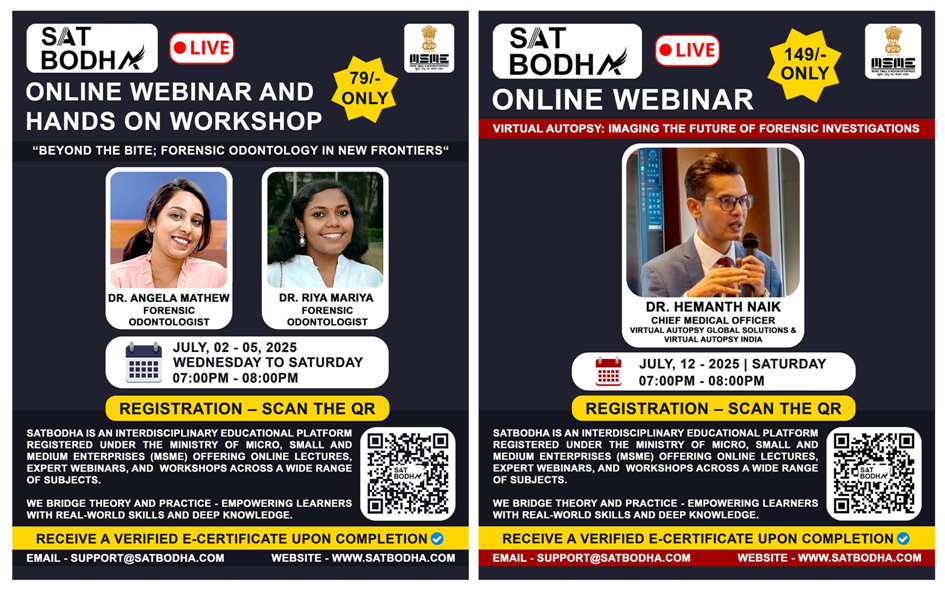 India – Satbodha, an MSME-registered educational platform, is proud to announce two upcoming live webinars focused on the future of forensic investigations. Known for delivering innovative education in forensic science, cybersecurity, and medical investigations, Satbodha is launching two major events: a webinar and hands-on workshop on Forensic Odontology, and a live session on Virtual Autopsy. Both programs are led by respected experts and aim to provide professionals and students with cutting-edge, real-world forensic knowledge.