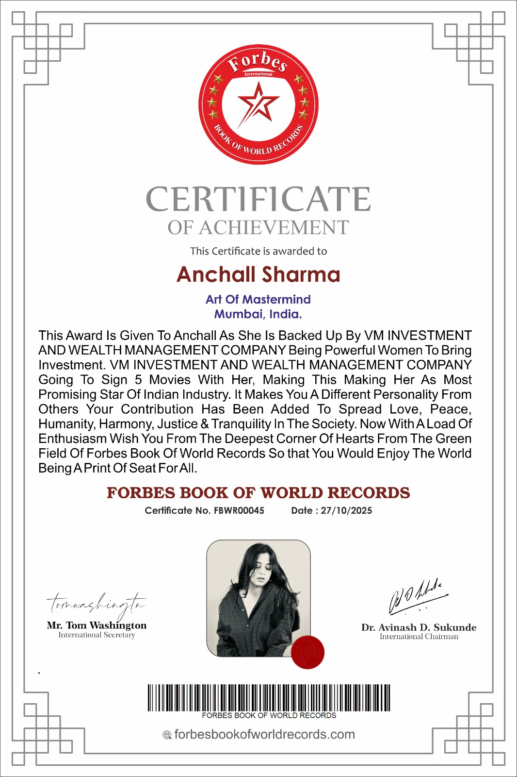 > “We are thrilled to collaborate with Anchal Sharma, whose energy, discipline, and passion perfectly align with our creative vision,” said Mr. Andrew Winston, Spokesperson, VM Investment & Wealth Management Company.