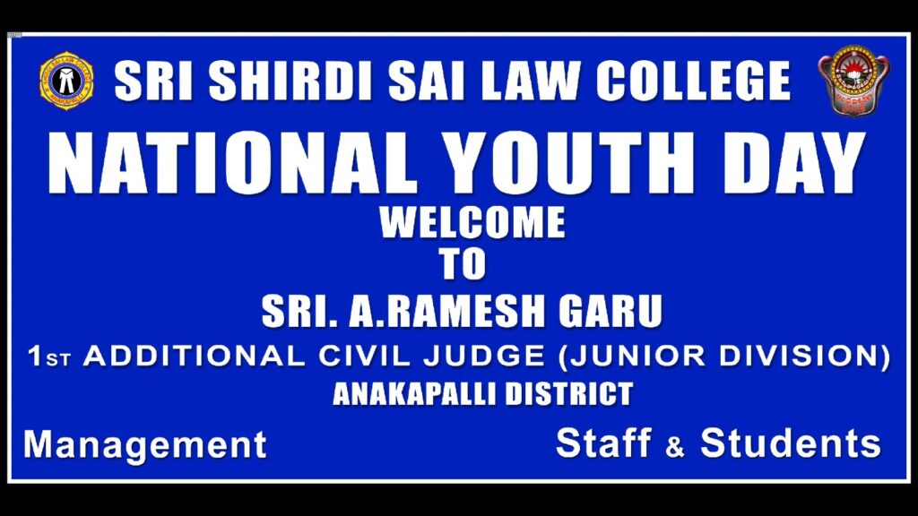 Shri Shirdi Sai Law College marked National Youth Day with great enthusiasm and academic spirit today, highlighting the vital role of youth in nation-building. On this auspicious occasion, the college was honored by the presence of Honourable 1st Additional civil judge (junior division) Sri A. Ramesh Garu, who graced the event as the Chief Guest.