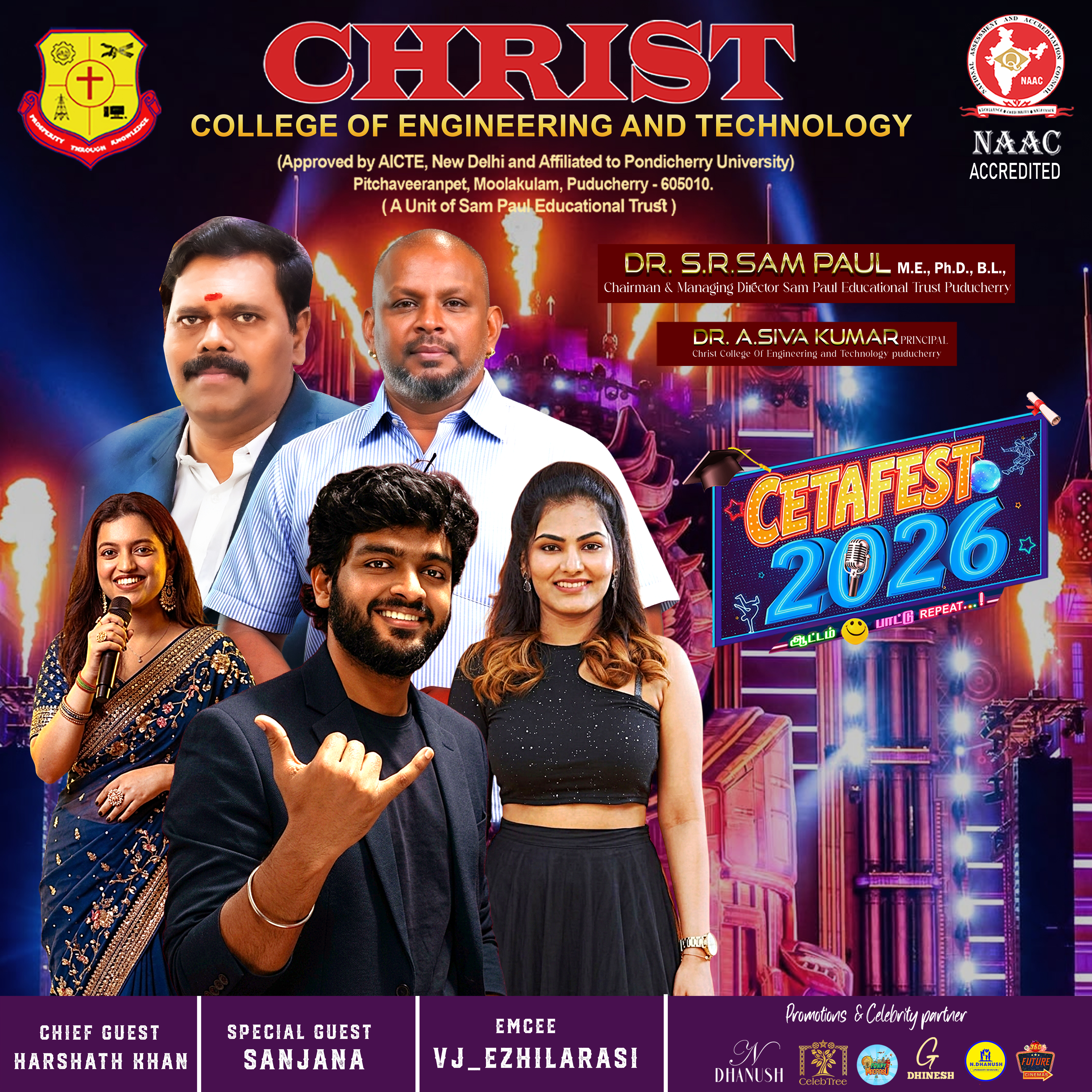 The grand event was presided over by Dr. Sam Paul, Managing Director of Sam Paul Educational Trust, who delivered the presidential address and officially released the college annual magazine. The celebration was further elevated by the presence of Three distinguished celebrity guests—renowned Mr.Harshath Khan( Actor), Ms.Sanjana kalmanji( Play Back Singer), Ms.Ezhilarasi(VJ& EMCE- SUN Network) and other dignitaries. This was widely recognized and shared across 100+ influencers and social media pages, showcasing the institution’s vibrant spirit and popularity.